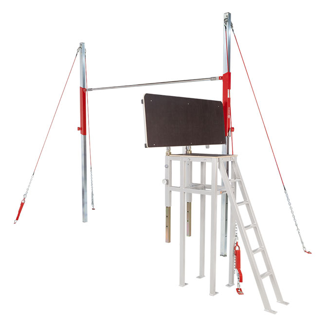 Training High Bar with short cable system and adjustable height! The single bar trainer includes a Men’s steel rail (#GN3110). Additional rail options available, and sold seperately are: Women’s Soft Fiberglass Rail (#GN3260) Women’s Hard Fiberglass Rail (#GN3262) NEW! Fiber Rail (#GN3565) NEW! Junior Pink Fiber Rail (#GN3268) This set is supplied with all anchoring hardware, plus a pair of pivots for pit mounting. An additional low, flat, connecting bar for floating floors is also available (#5176-200). ITEM NO: 5176-010-M