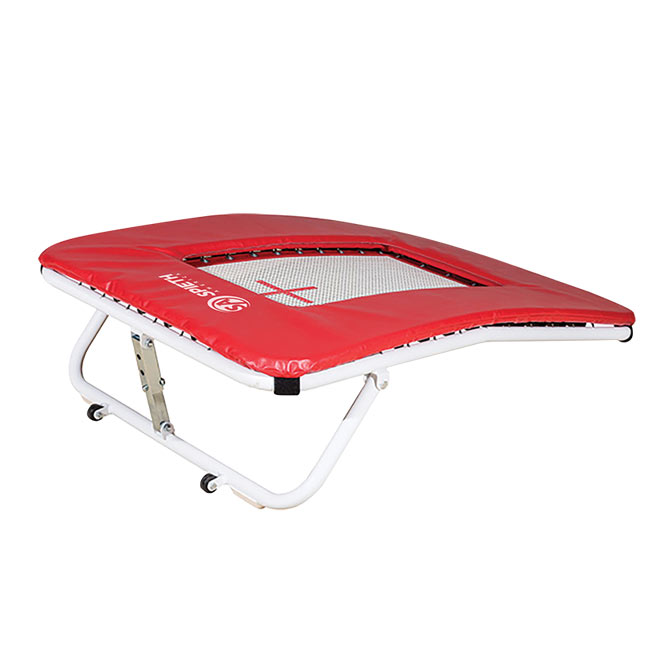 Mini, adjustable trampoline with a total top trampoline surface of 24” W x 36” H. Wheels on the frame allow for easy transport while rubber grips on the bottom prevent sliding. ITEM NO: 5006-100